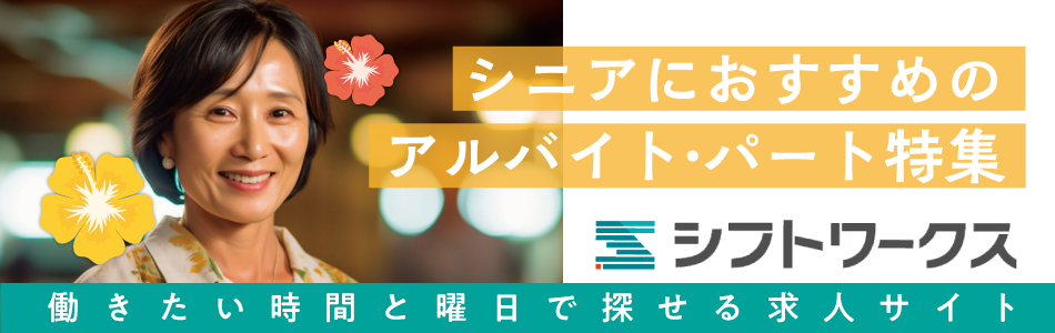 - 「シニアが活躍できるアルバイトを、より簡単に探す方法を教えて欲しい」そんな要望を持っているシニアの皆さんは少なくないと思います。近年はシニアを歓迎する募集も多くなり、インターネット上の求人メディアでは、シニア歓迎の求人を検索できるものも少なくない状況です。そんな中、シニアの皆さんにおすすめするのが「働きたい曜日と時間で探せるアルバイトサイト/シフトワークス」です。シフトワークスでは「シニアが活躍中のアルバイト特集。」を設定し、シニアの皆さんにおすすめのアルバイトを紹介。また、シフトワークスでは、働きたい時間や曜日からアルバイトを探せるので、とっても便利です。探し方はとっても簡単。下にある「シニアが活躍中のアルバイト特集/シフトワークス」からエリアボタンをタップするだけです。ぜひ、シニアの皆さんを歓迎するアルバイトを探してみてください。